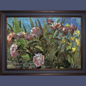 Утренние пионы Цена: 460 000 руб. шт. Новинка Мозаичная картина размер: 38*54 см Материал: смальта Техника: мозаика, фигуративный модуль Оформление: деревянный багет